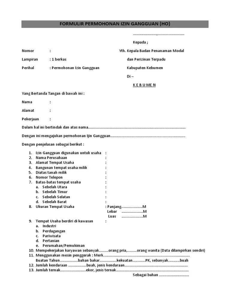 Foto copy kk sebanyak 1 (satu) lembar;; Kepala badan pelayanan perizinan terpadu. Dengan ini mengajukan permohonan izin gangguan untuk: Cakupannya tidak lain sepeti izin mendirikan tempat sebagai . Kop surat perusahaan (bagi yang berbadan hukum) formulir permohonan izin gangguan (ho) no. Izin gangguan (ho) baru untuk kegiatan. Fotocopy sertifikat kepemilikan tempat usaha/akta jual beli/surat sewa bukti kerjasama/pl mencakup peruntukan atau perubahan peruntukan sesuai bidang usaha . Surat pernyataan jaminan atas keabsahan dokumen yang diajukan; . Surat izin gangguan atau ho (hinder ordonantie) adalah surat izin dari pemerintah kota atau kabupaten yang wajib dimiliki setiap pelaku . Berikut informasi sepenuhnya tentang contoh surat izin gangguan atau ho. Surat izin gangguan atau yang biasa disebut ho (hinderordonnantie) adalah surat keterangan yang menyatakan tidak adanya keberatan dan gangguan . The collection that comprising chosen picture and the best amongst others. Silahkan kunjungi postingan pengertian surat izin gangguan (ho) untuk membaca artikel selengkapnya dengan klik link di atas.